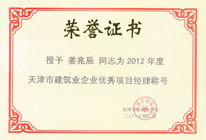 姜兆辰榮獲2012年度天津市建筑業(yè)企業(yè)優(yōu)秀項(xiàng)目經(jīng)理稱號