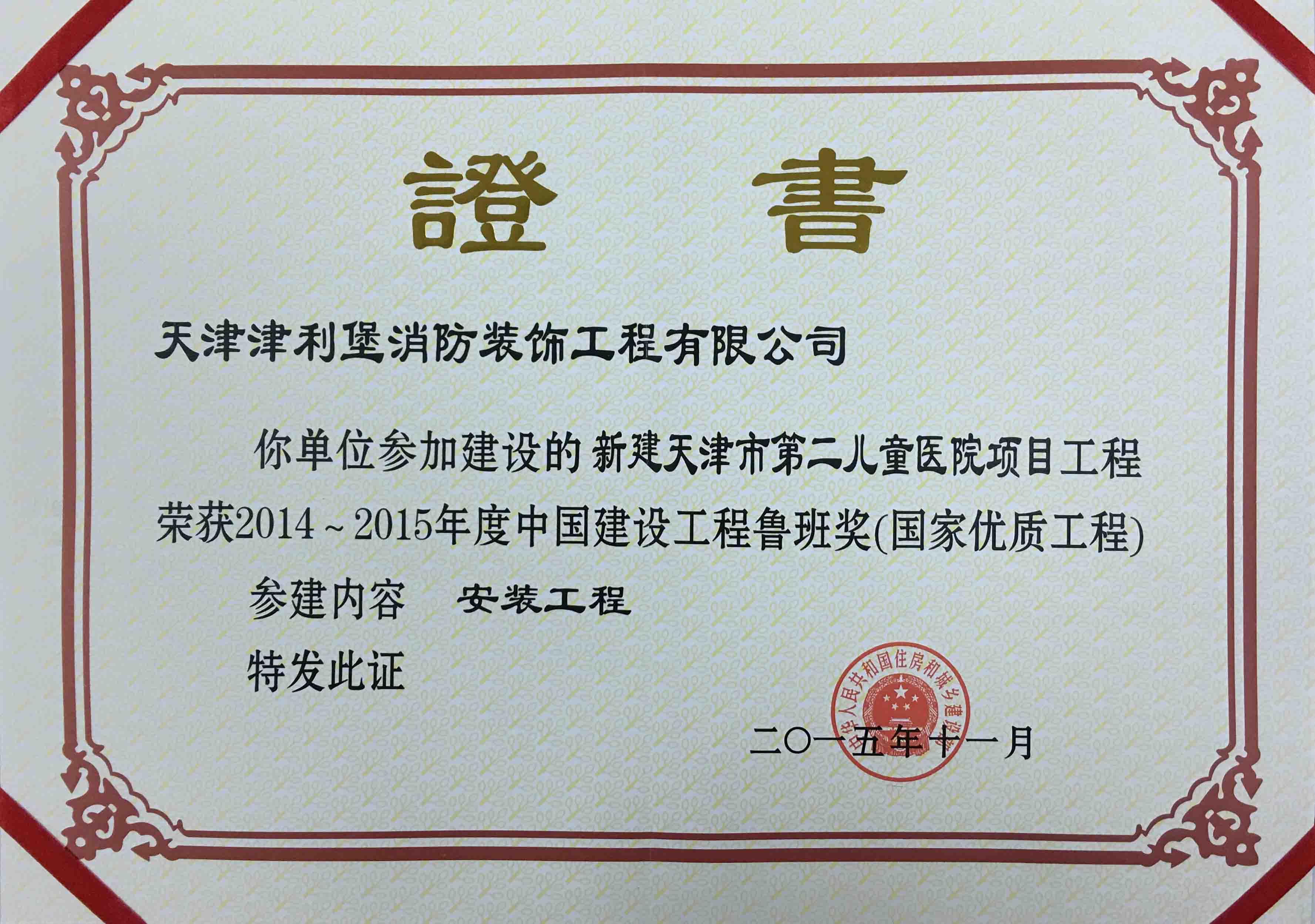 新建天津市第二兒童醫(yī)院項(xiàng)目榮獲“中國(guó)建設(shè)工程魯班獎(jiǎng)(國(guó)家優(yōu)質(zhì)工程)”榮譽(yù)稱號(hào)