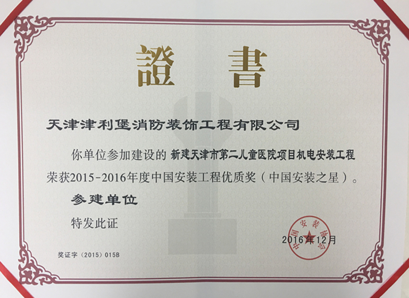 新建天津市第二兒童醫(yī)院項(xiàng)目榮獲“2015-2016年度中國(guó)安裝工程優(yōu)質(zhì)獎(jiǎng)(中國(guó)安裝之星)”榮譽(yù)稱號(hào)