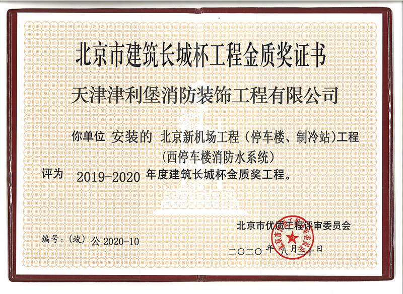 北京新機(jī)場(chǎng)工程(停車(chē)樓、制冷站)工程(西停車(chē)樓消防水系統(tǒng))項(xiàng)目榮獲“2019-2020年度北京市建筑長(zhǎng)城杯工程金質(zhì)獎(jiǎng)”榮譽(yù)稱(chēng)號(hào)