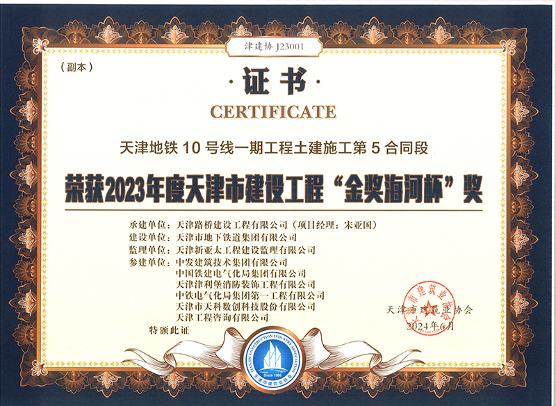 天津地鐵10號線一期工程土建施工第5合同段榮獲2023年度天津市建設(shè)工程“金獎海河杯”獎